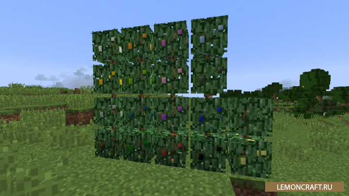 Мод на кусты с ягодами Berry Bushes добавляет в игру новые растения, которые вы можете использовать не только в качестве пищи, но и как краситель. Новых кустов будет очень много, но отличаться они будут только цветом. Спавн данных растений наблюдается по всему мру, так что найти их не составит особого труда. Так же вы можете использовать данные растения для декора территории вокруг вашего дома.